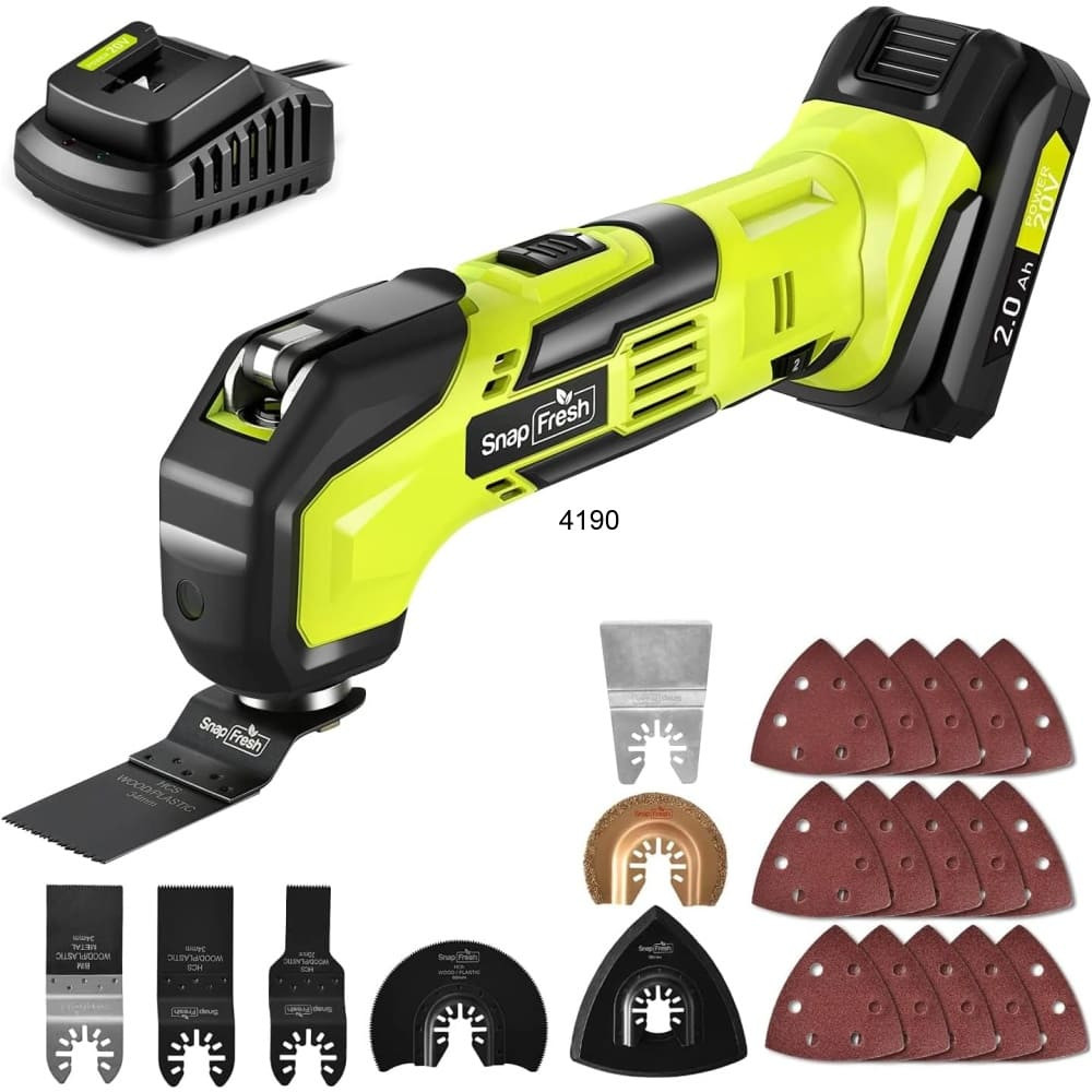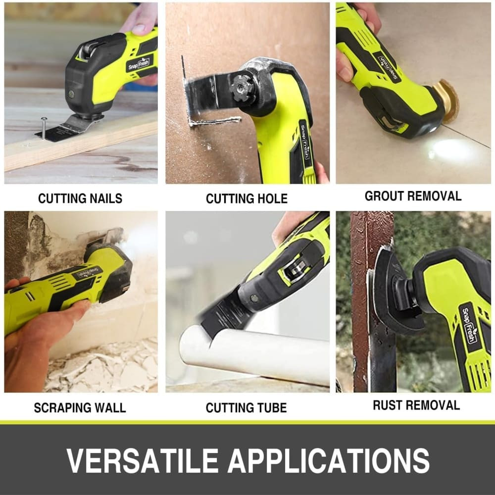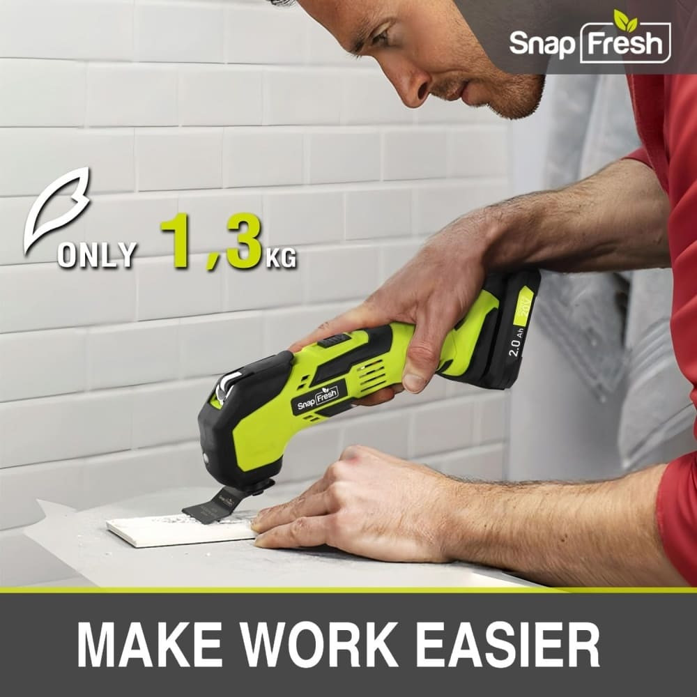 Akumulátorová oscilační pila určená pro řezání, broušení, škrábání a čištění různých materiálů.