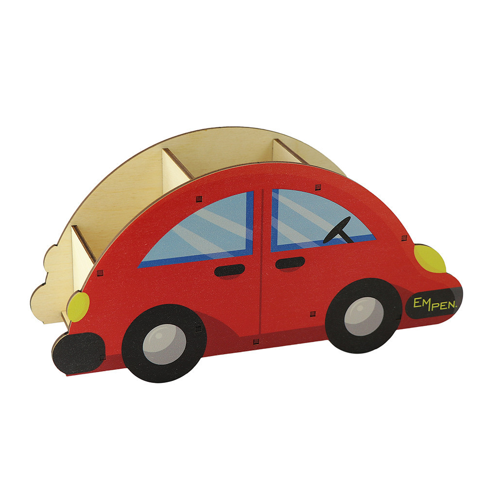 Dětský dřevěný stojánek na psací potřeby ve tvaru osobního automobilu. Stojánek se třemi přihrádkami nabízí dostatečný prostor pro uložení pastelek, fix a dalších psacích pomůcek. Hravý motiv automobilu ve veselých barvách skvěle zapadne do interiéru dětského pokoje a napomůže v dětech objevit radost ze psaní, kreslení a tvoření již v útlém věku. Stojánek je vyrobený z překližky. Výroba tohoto stojánku, včetně jeho designu, je společným dílem našeho grafického studia a výroby.