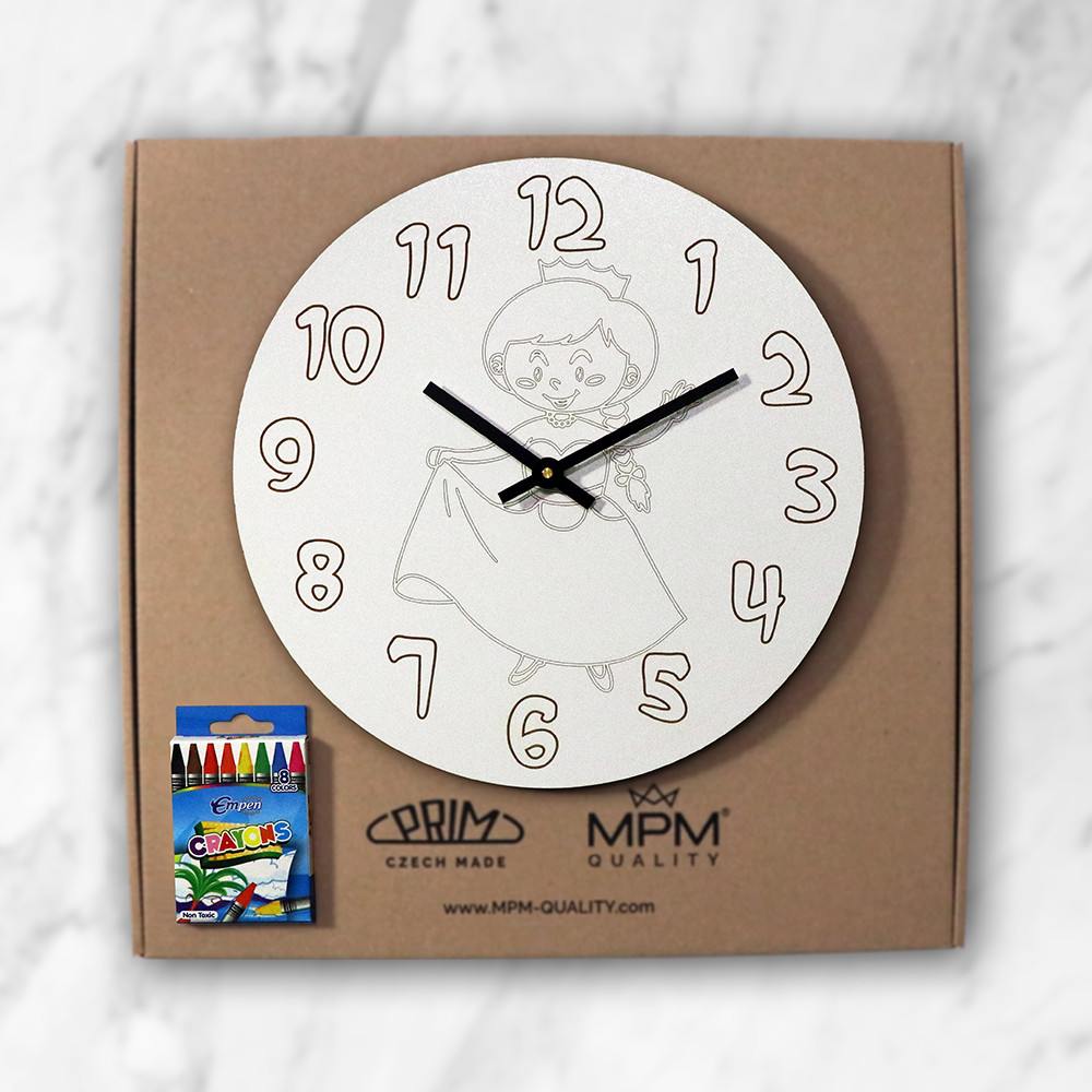 Eredeti fa falióra MPM Dawson DIY színes gyerekes motívumokkal. A csomagolás tartalmazza a zsírkrétákat is. Színezésre alkalmas tempera festék vagy alkoholos filc is (a csomagolás nem tartalmazza). Folyamatosan járó Quartz óraszerkezettel. Az óra félkemény farostlemezből (MDF) készült, Csehországban gyártva.