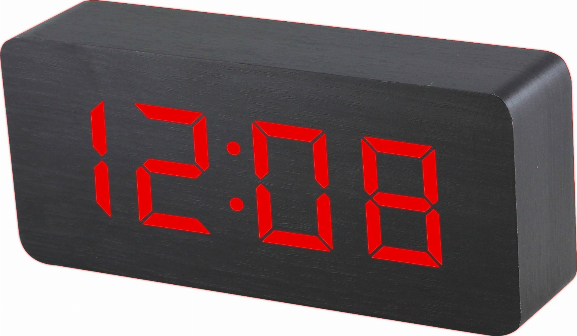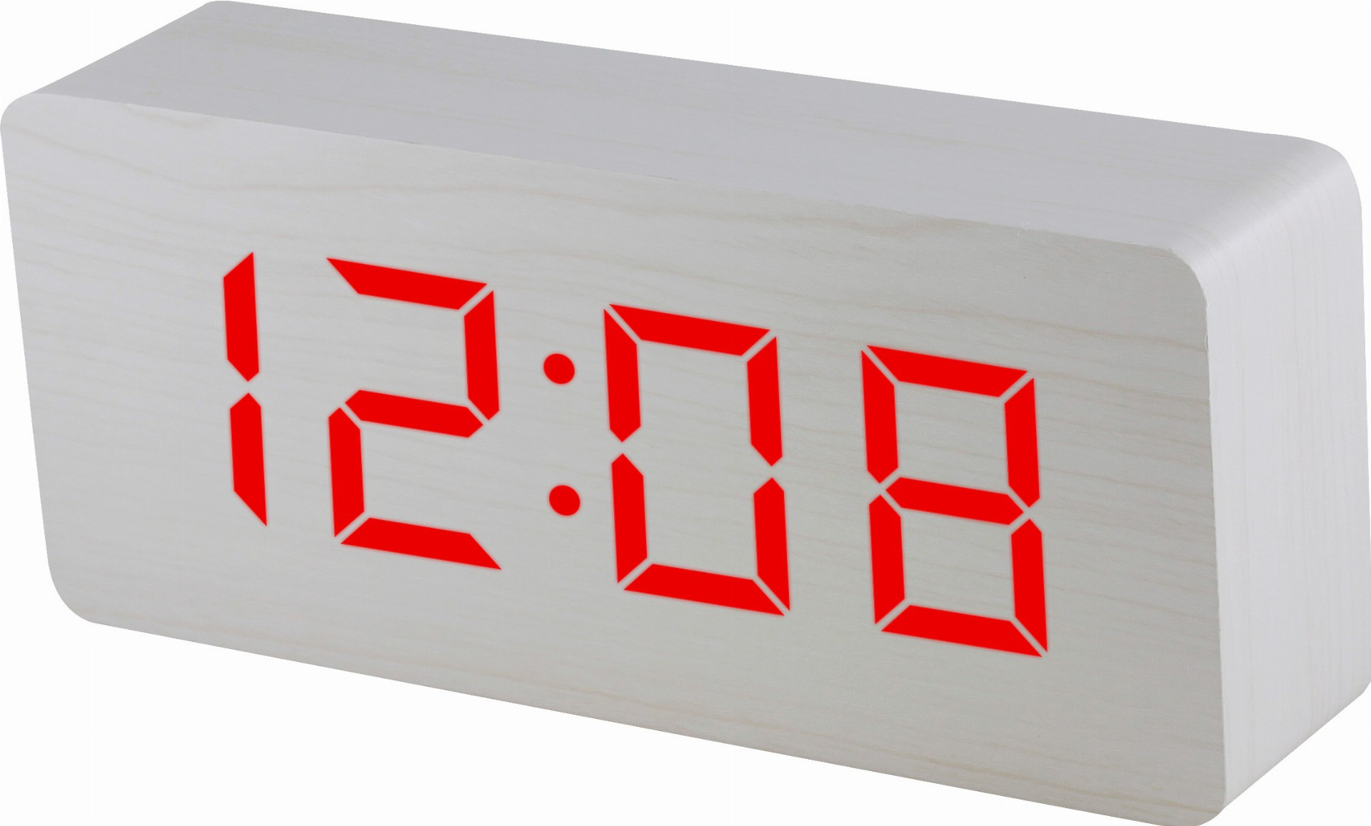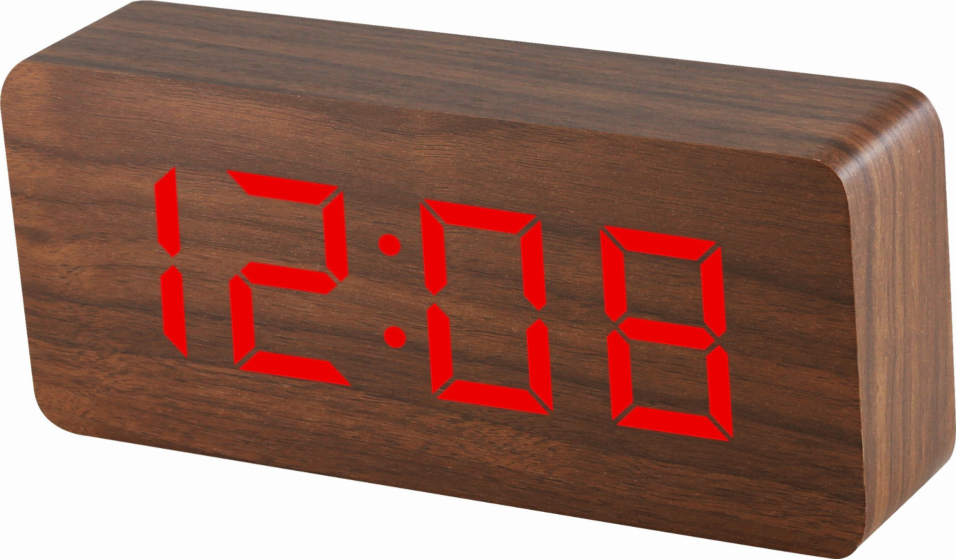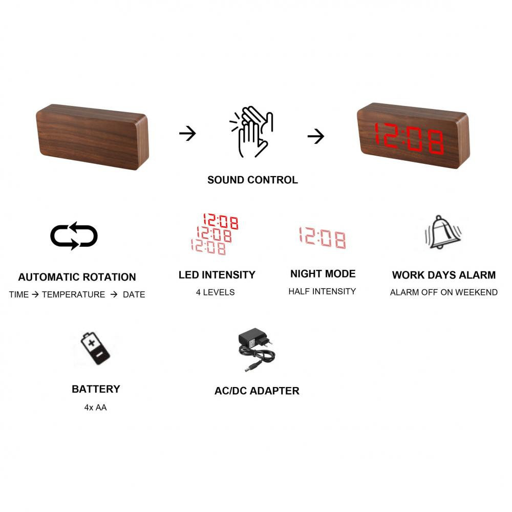 Digitální budík s červenými LED diodami v dřevěném vzhledu. Se zvukovým senzorem, datem a teploměrem, možnost volby automatické rotace údajů a intenzity displeje. Napájecí adaptér je součástí balení.