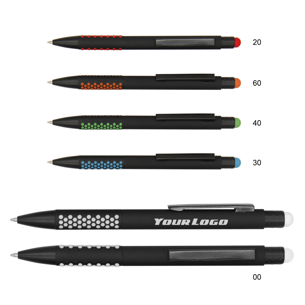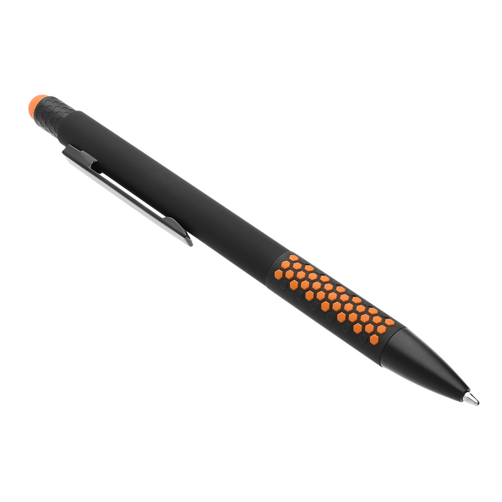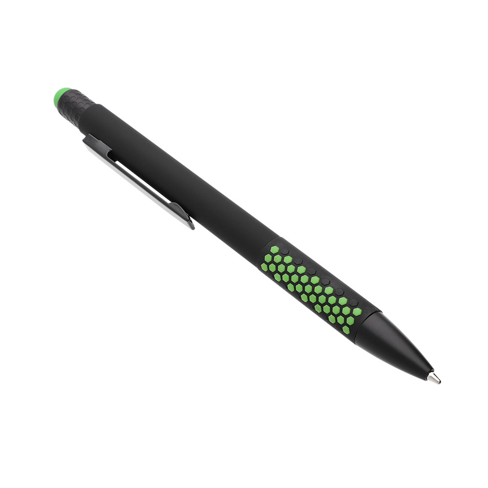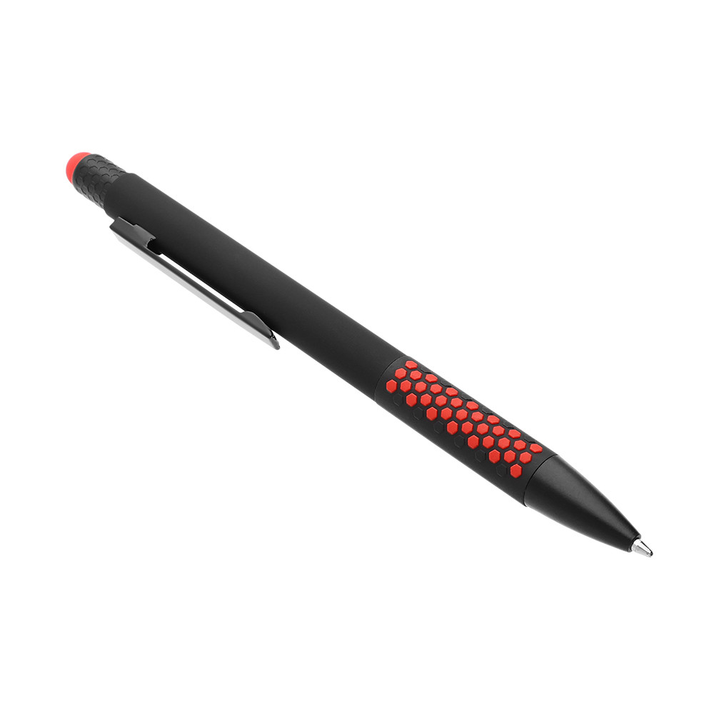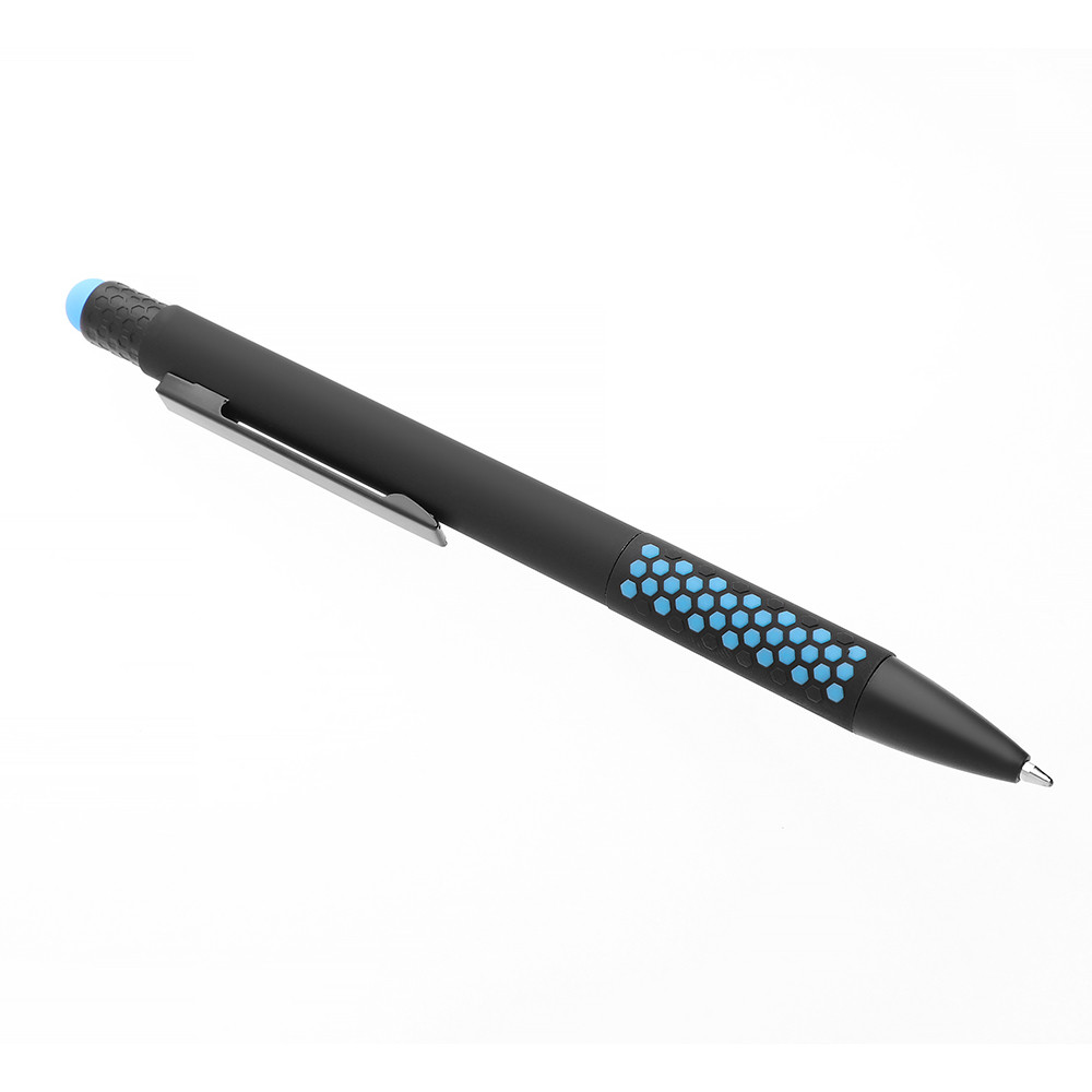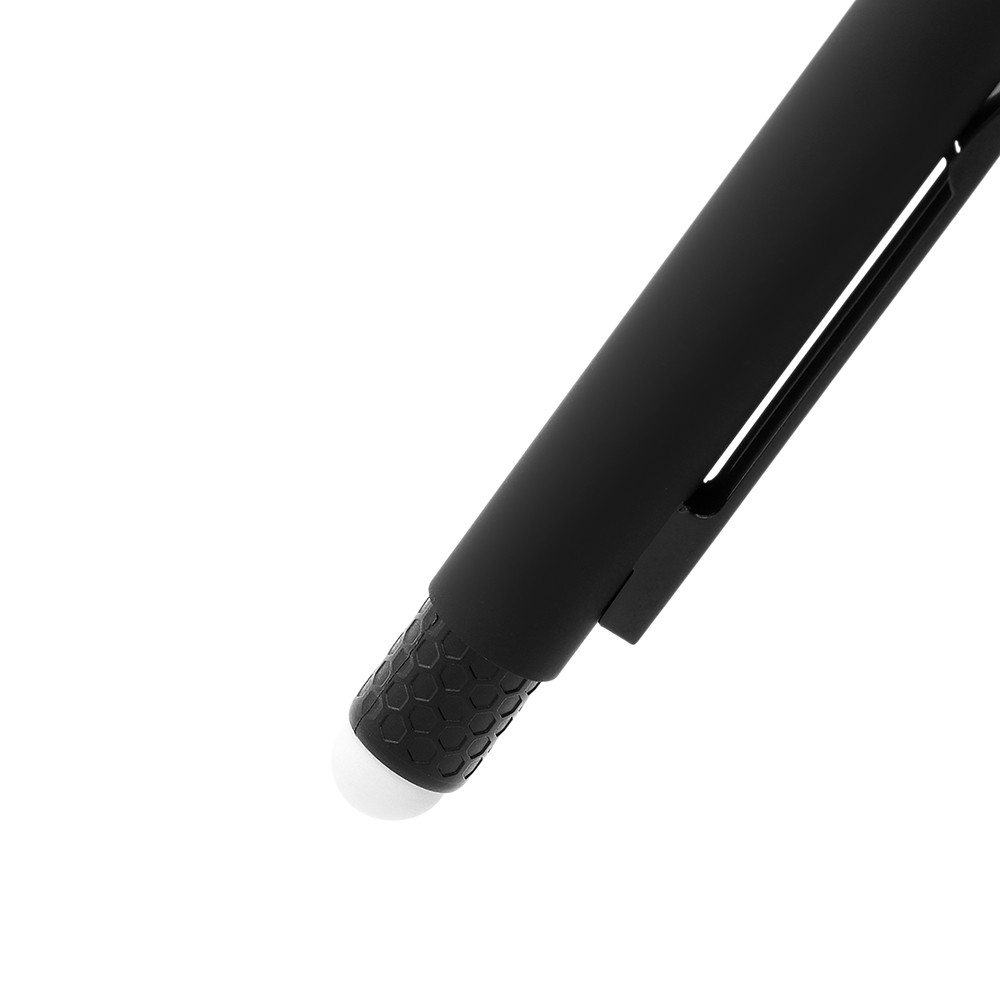 Černá moderní hliníková propiska s pogumovaným úchopem, matně černým klipem a stylusovým zakončením (touch-pad).