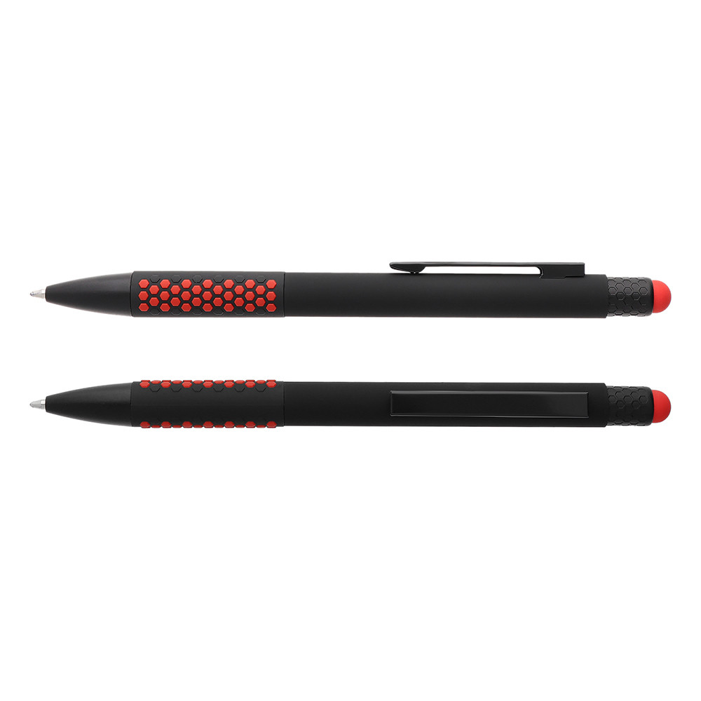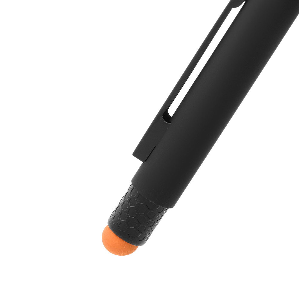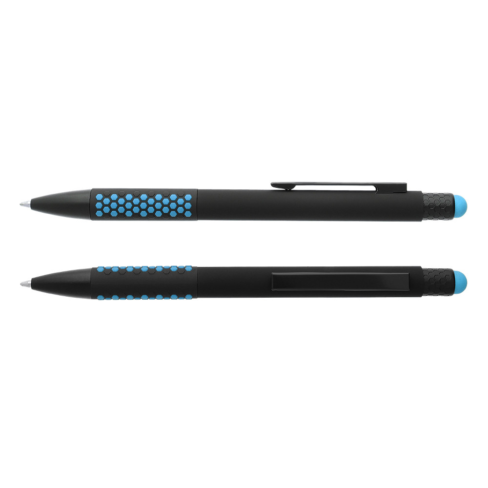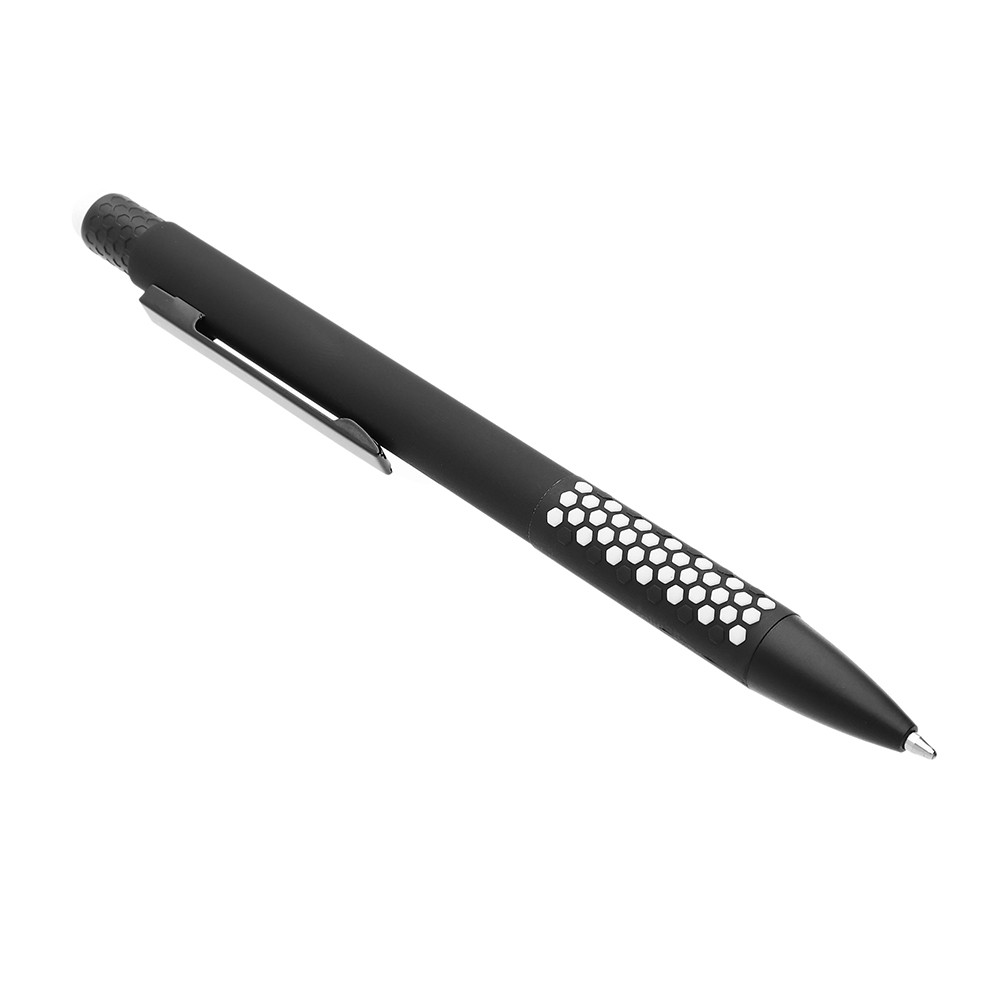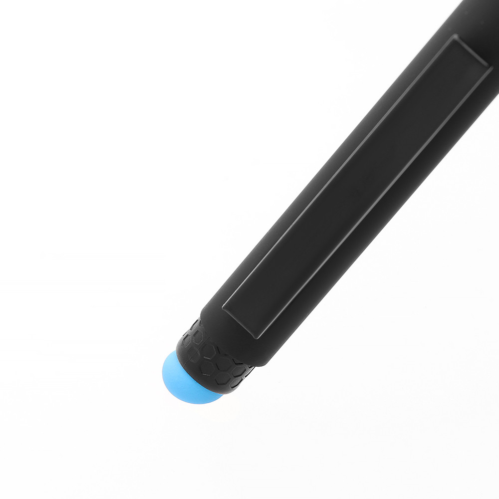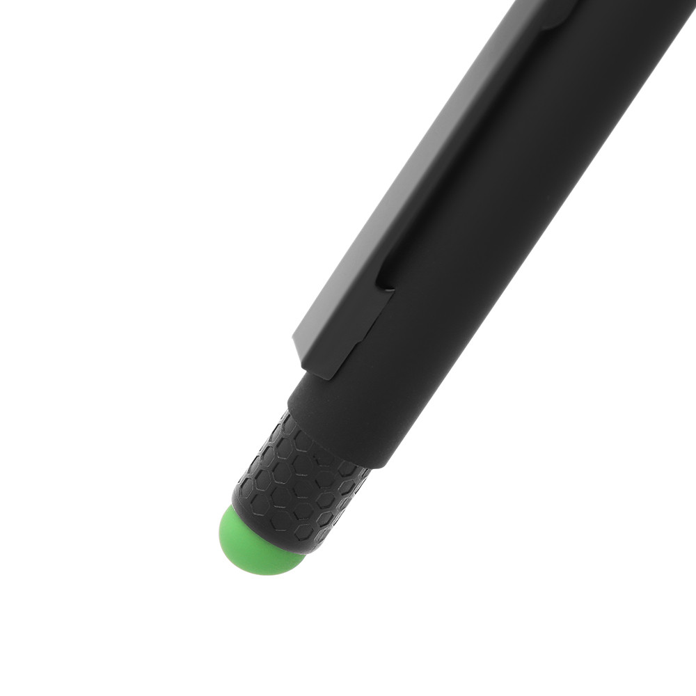 Černá moderní hliníková propiska s pogumovaným úchopem, matně černým klipem a stylusovým zakončením (touch-pad).