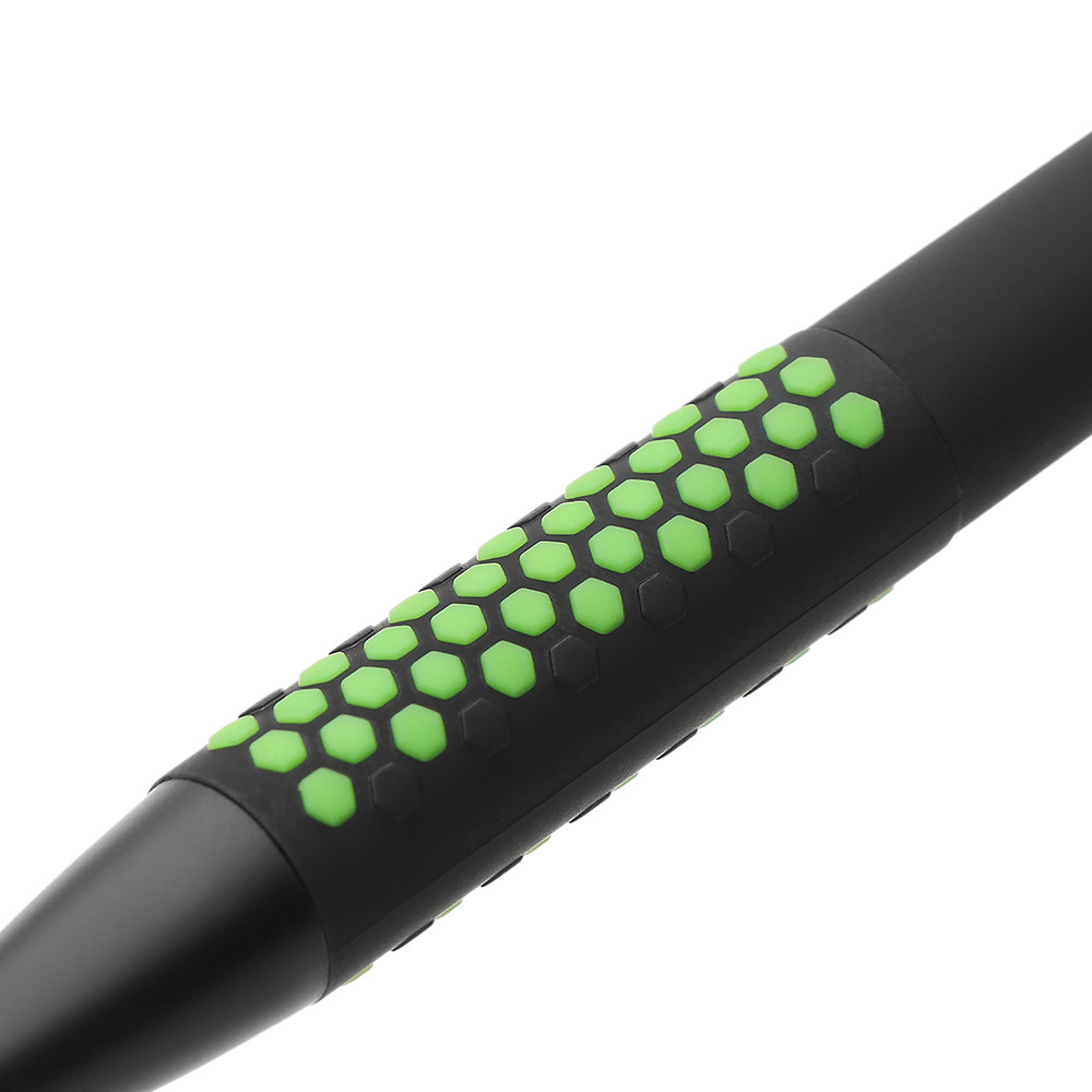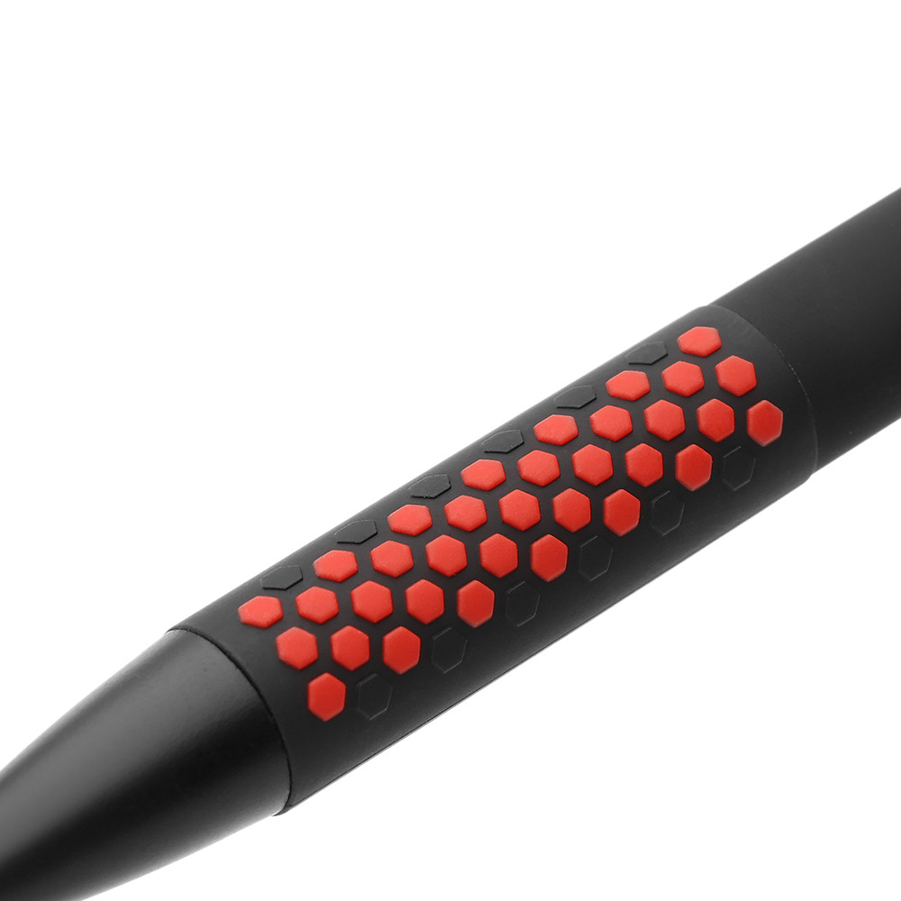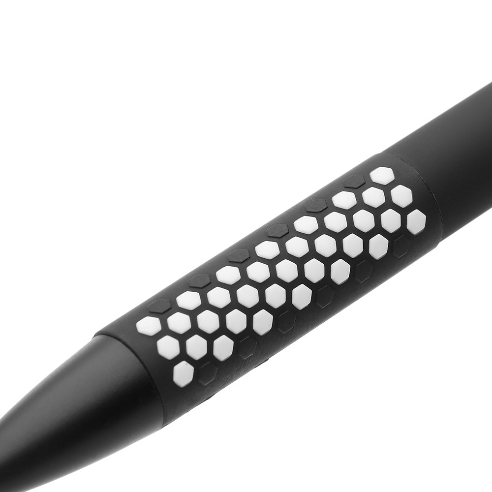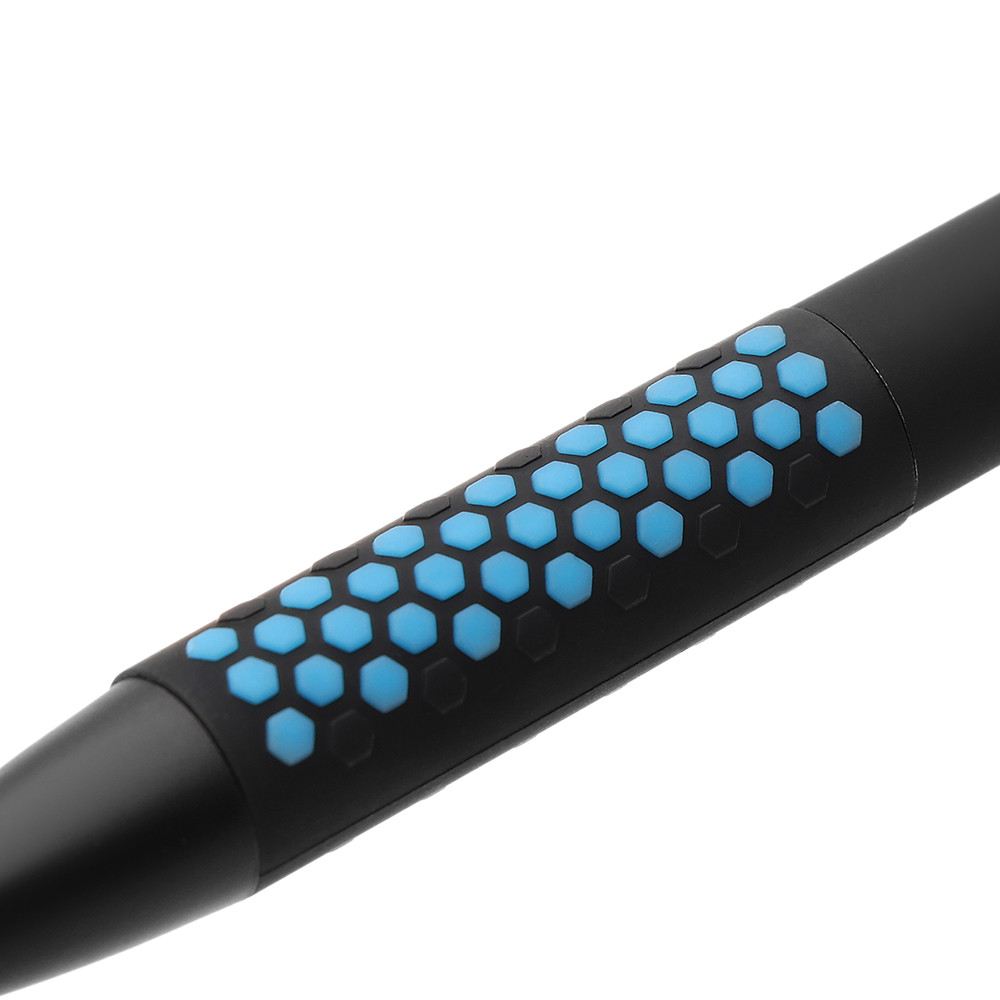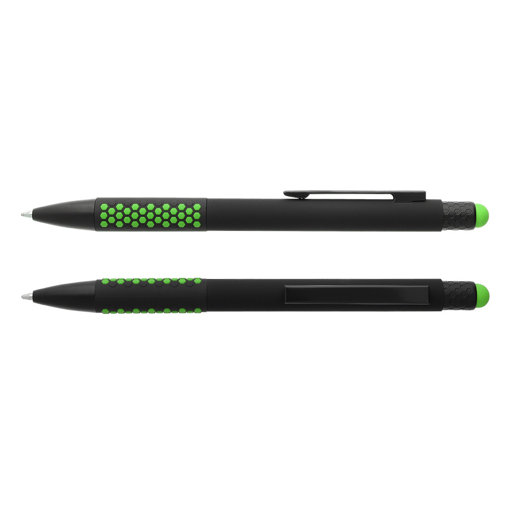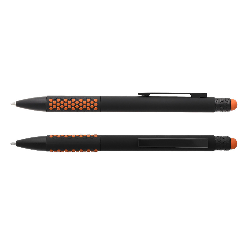 Černá moderní hliníková propiska s pogumovaným úchopem, matně černým klipem a stylusovým zakončením (touch-pad).