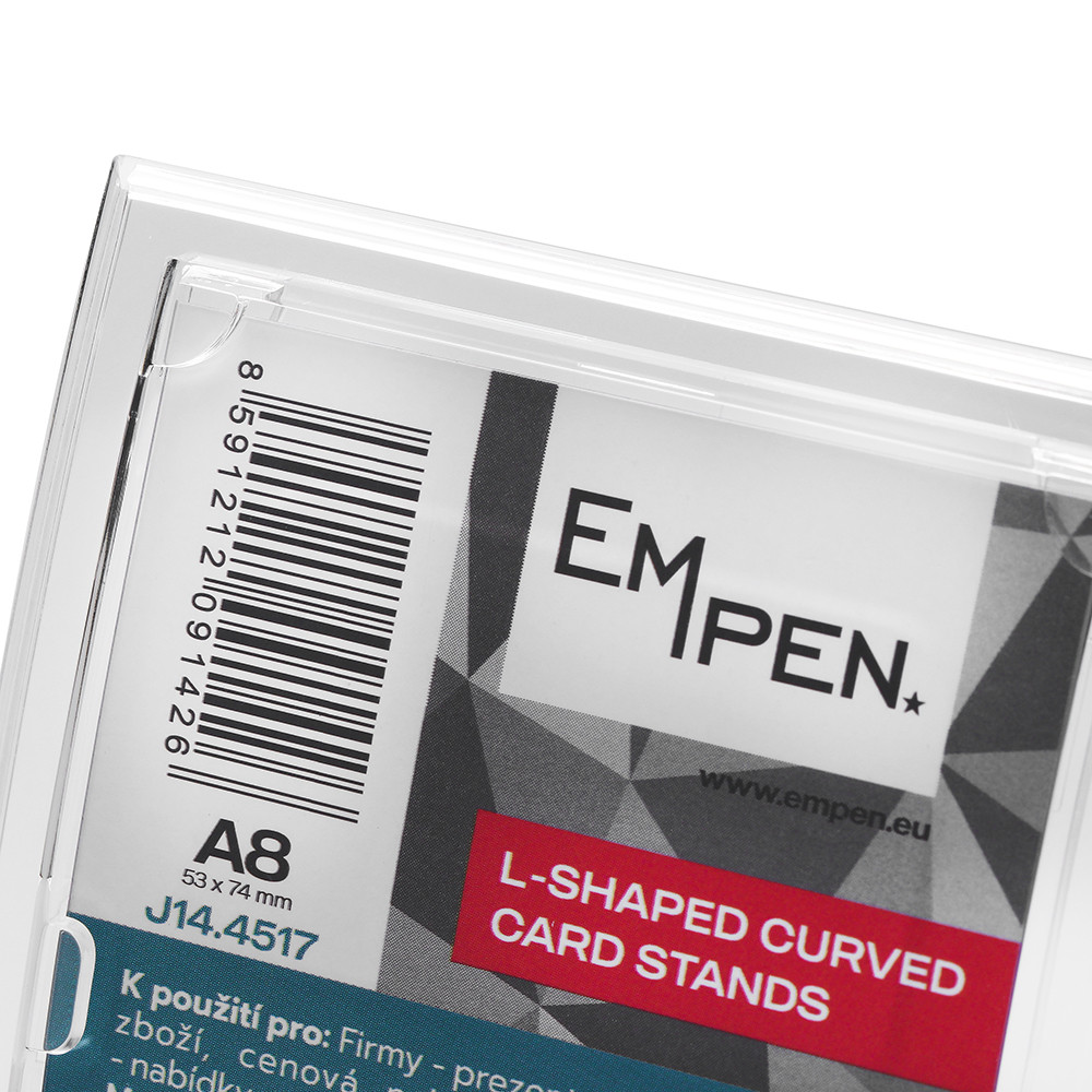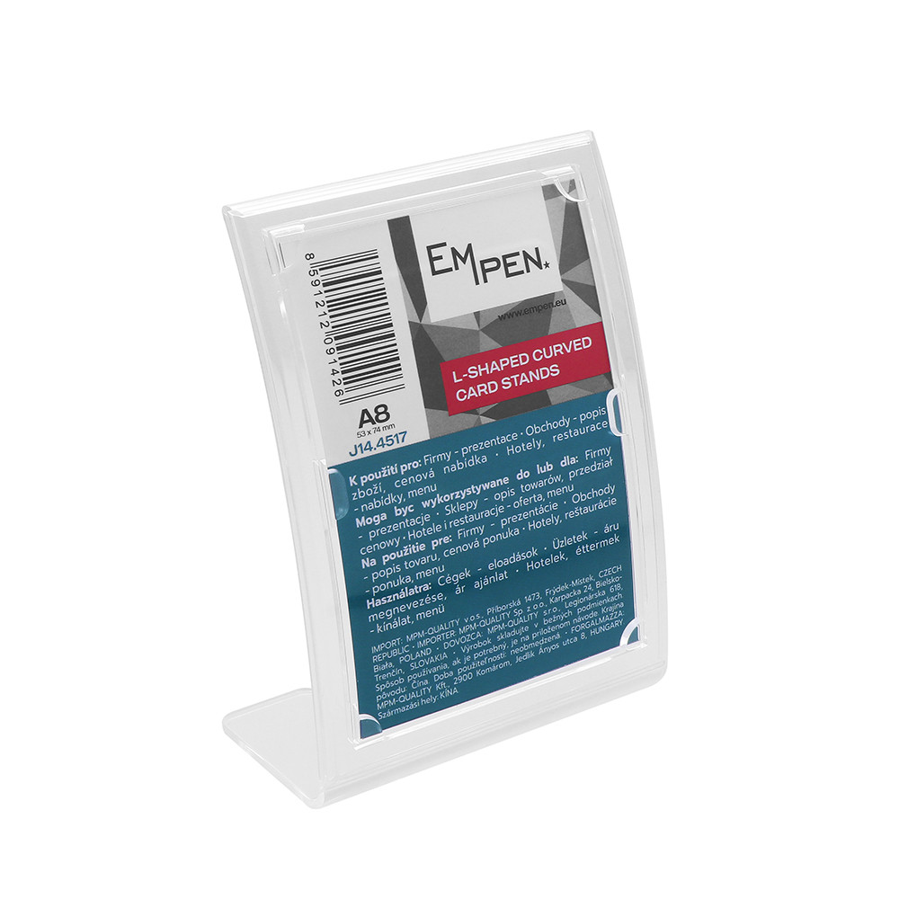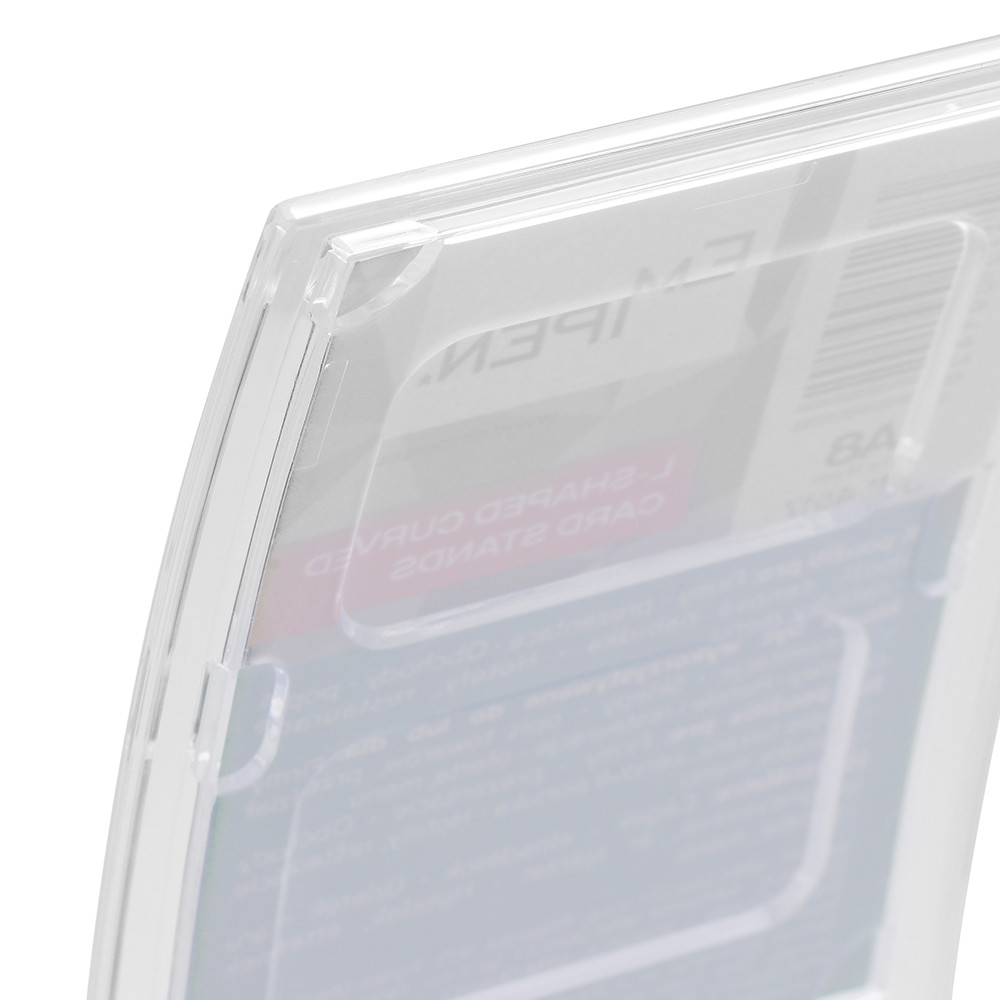 Zakřivený průhledný plastový stojánek formátu A8. Rozměr stojánku je 67 x 85 x 28 mm, vnitřní velikost 53 x 74 mm.