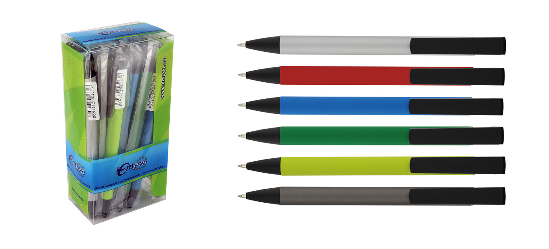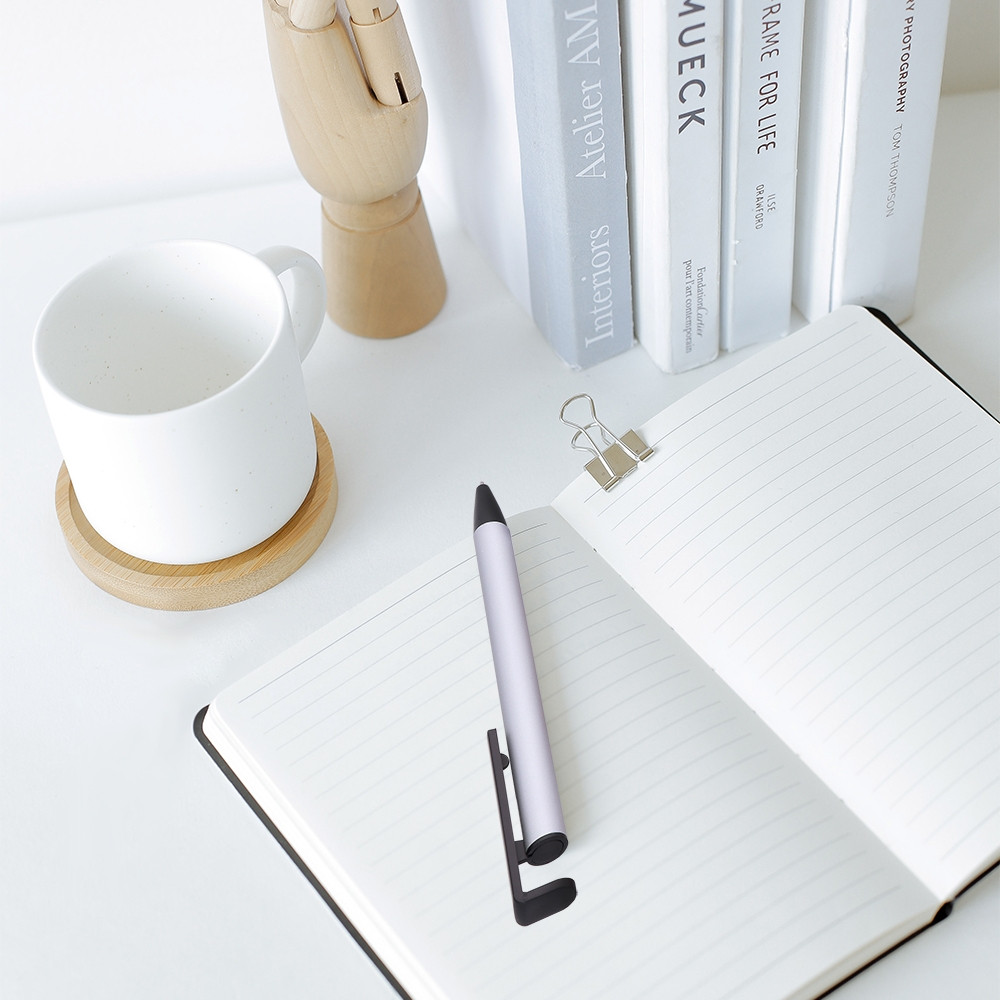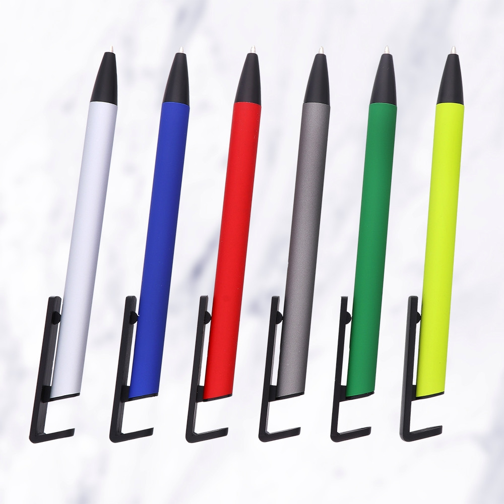 Hliníkové guľôčkové pero s pogumovaným povrchom a stojančekom na mobil